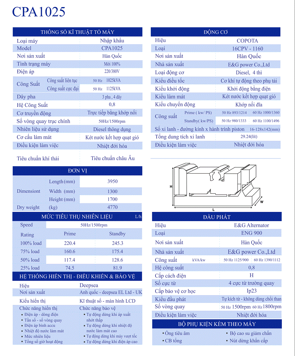 Máy phát điện COPOTA CPA1025 là dòng máy tiết kiệm nhiên liệu. Được sử dụng bằng động cơ Diesel 4 thì, đây là loại động cơ sử dụng nhiên liệu Diesel. Nó có giá thành rẻ hơn so với các dòng máy phát điện chạy bằng xăng và gas. Công ty Thuận Phong là đơn vị chuyên cung cấp các dòng máy phát điện. Có bảo hành đầy đủ và vận chuyển tận nơi. Khách hàng có thể liên hệ 0909 724 830 để được nhân viên hỗ trợ tư vấn nếu đang tìm cho mình một dòng máy phát điện phù hợp.