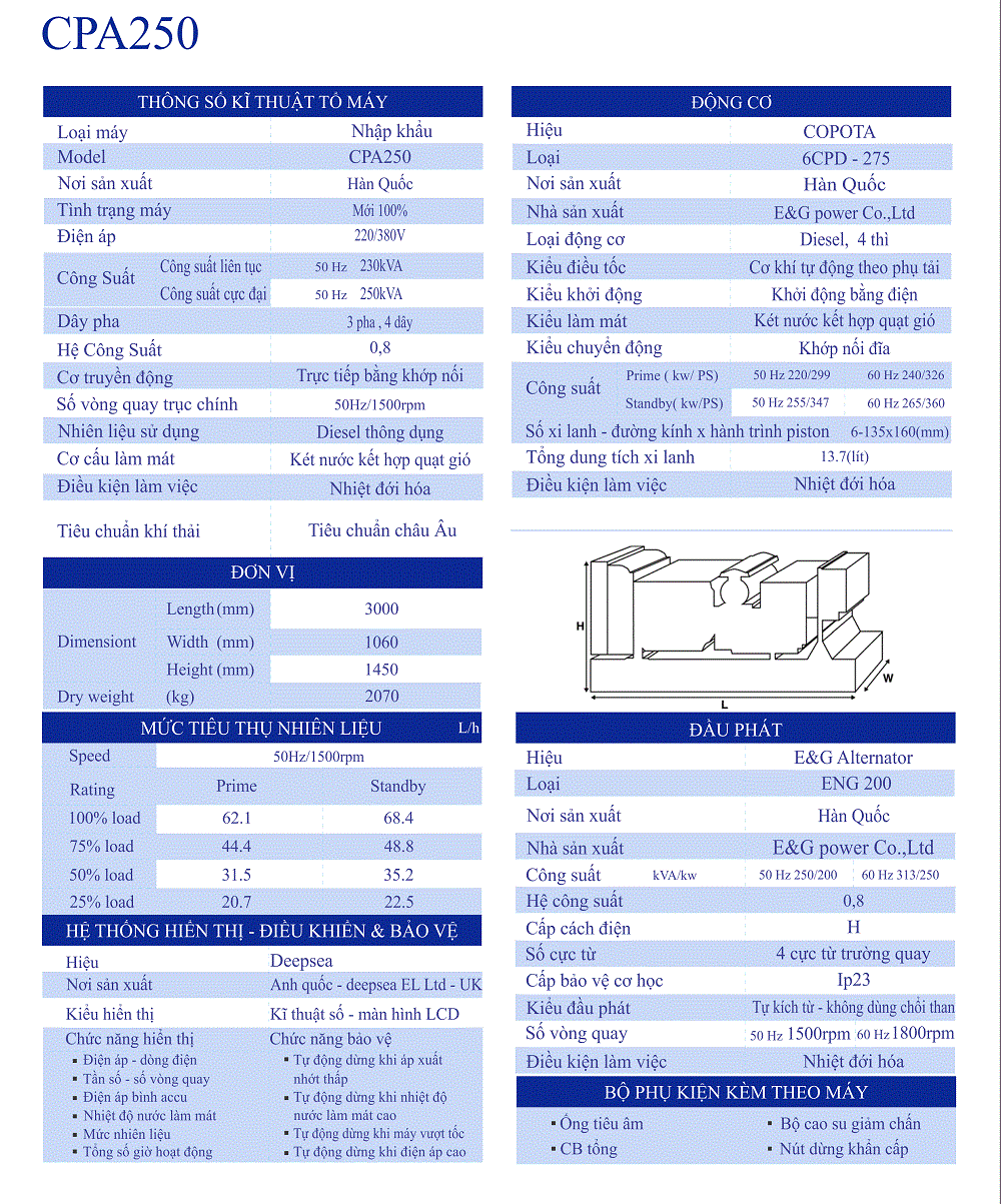 Máy phát điện COPOTA CPA250 là dòng máy với động cơ Diesel 4 thì. Sản xuất tại Hàn Quốc và được công ty Thuận Phong nhập về nguyên chiếc. Cung cấp cho khách hàng trên địa bàn cả nước. Tuy hình dáng hơi cồng kềnh nhưng giá thành cũng như giá nhiên liệu sử dụng nó lại rẻ hơn rất nhiều so với các dòng máy phát điện chạy bằng xăng. Phù hợp với điều kiện của các gia đình hay hộ kinh doanh. Nếu khách hàng đang tìm mua một dòng máy phát điện cho gia đình, hãy liên hệ 0909 724 830. Nhân viên chăm sóc khách hàng của Thuận Phong hỗ trợ tư vấn, báo giá, bán hàng, giao hàng cùng các chế độ bảo hành tốt nhât cho khách hàng.