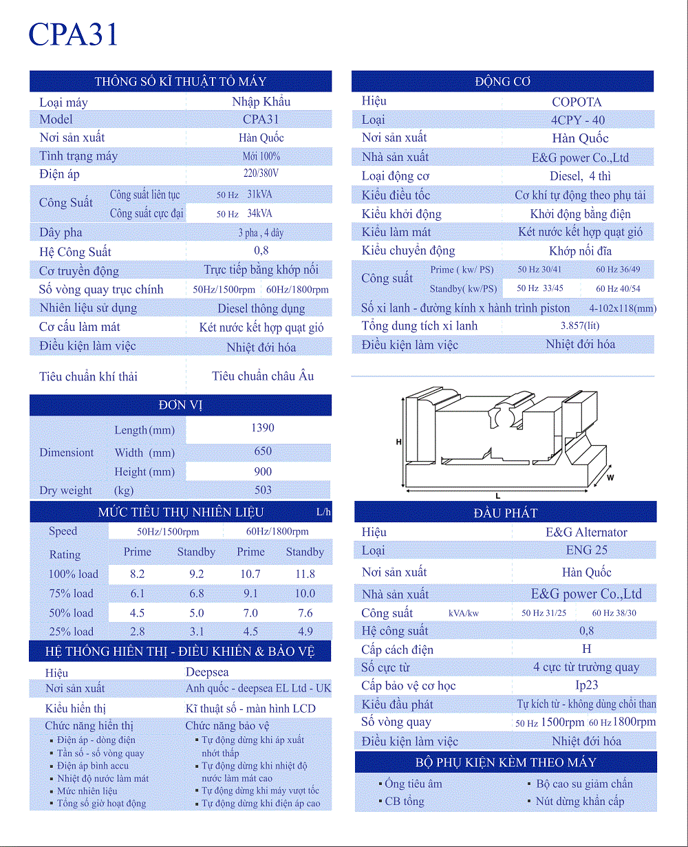Thuận Phong là đơn vị cung cấp các dòng máy phát điện phổ biến trên thị trường. Máy phát điện COPOTA CPA31 là loại máy được nhập khẩu tại Hàn Quốc, dùng động cơ Diesel 4 thì. Mang lại hiệu quả cao cho khách hàng khi sử dụng. Nếu khách hàng có nhu cầu mua máy phát điện Diesel, máy phát điện Biogas hay các dòng máy đã qua sử dụng thì có thể liên hệ với Thuận Phong qua hotline: 0909 724 830. Đội ngũ nhân viên sẽ tư vấn tận tình, cho khách hàng có sự lựa chọn phù hợp nhất với điều kiện của mình.