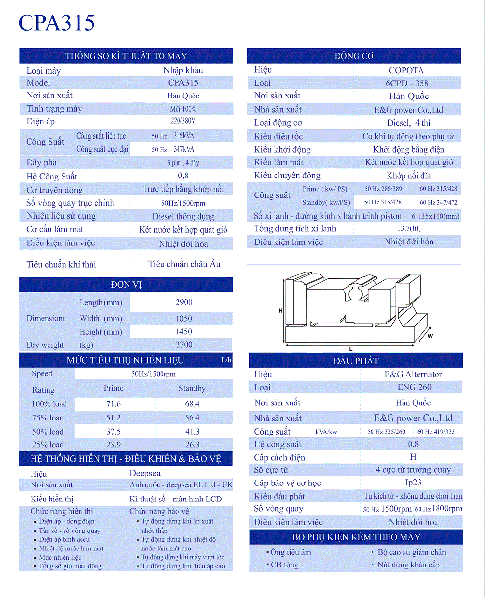 COPOTA CPA315 là dòng máy phát điện chạy bằng động cơ Diesel 4 thì. Được nhập khẩu nguyên chiếc từ Hàn Quốc. Công ty Thuận Phong là nơi cung cấp các dòng máy phát điện phổ biến trên thị trường hiện nay. Giúp khách hàng đảm bảo nguồn điện sử dụng trong gia đình hay kinh doanh. Có rất nhiều sản phẩm máy phát điện tại Thuận Phong như máy phát điện Diesel, máy phát điện Biogas, các dòng máy đã qua sử dụng. Khách hàng liên hệ 0909 724 830 để được tư vấn và chọn cho gia đình mình được một sản phẩm phù hợp nhất.