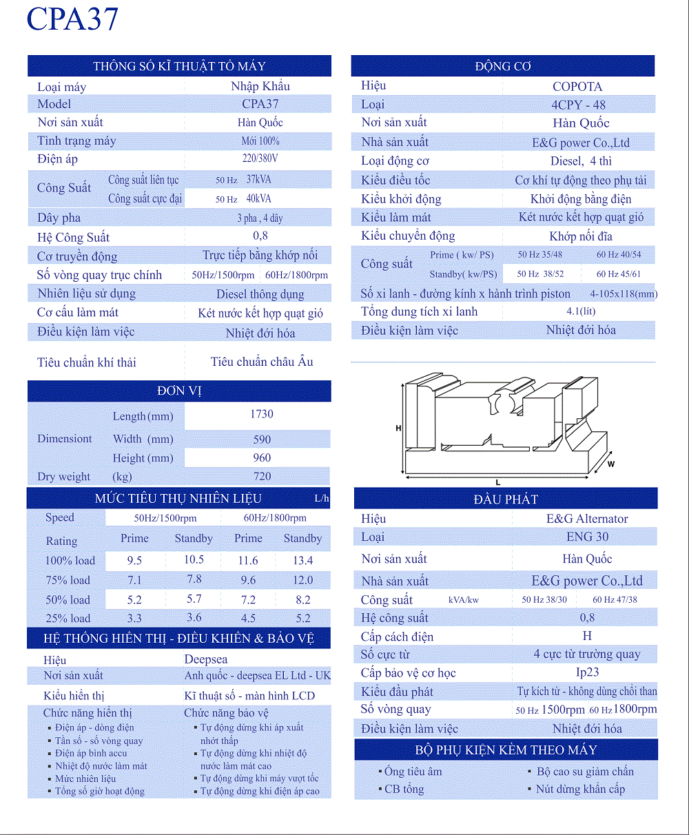 COPOTA CPA37 là một dòng máy phát điện được nhập khẩu từ Hàn Quốc. Với động cơ Diesel 4 thì giúp máy hoạt động tốt hơn so với những loại khác. COPOTA CPA37 được công ty Thuận Phong cung cấp và phân phối trên địa bàn cả nước. Với các dòng máy phát điện Diesel, máy phát điện Biogas hay các dòng máy đã qua sử dụng. Thuận Phong đảm bảo về chất lượng, giá cả và chế độ bảo hành tốt nhất. Khách hàng có thể liên hệ 0909 724 830 để được tư vấn kỹ hơn về các dòng máy này.