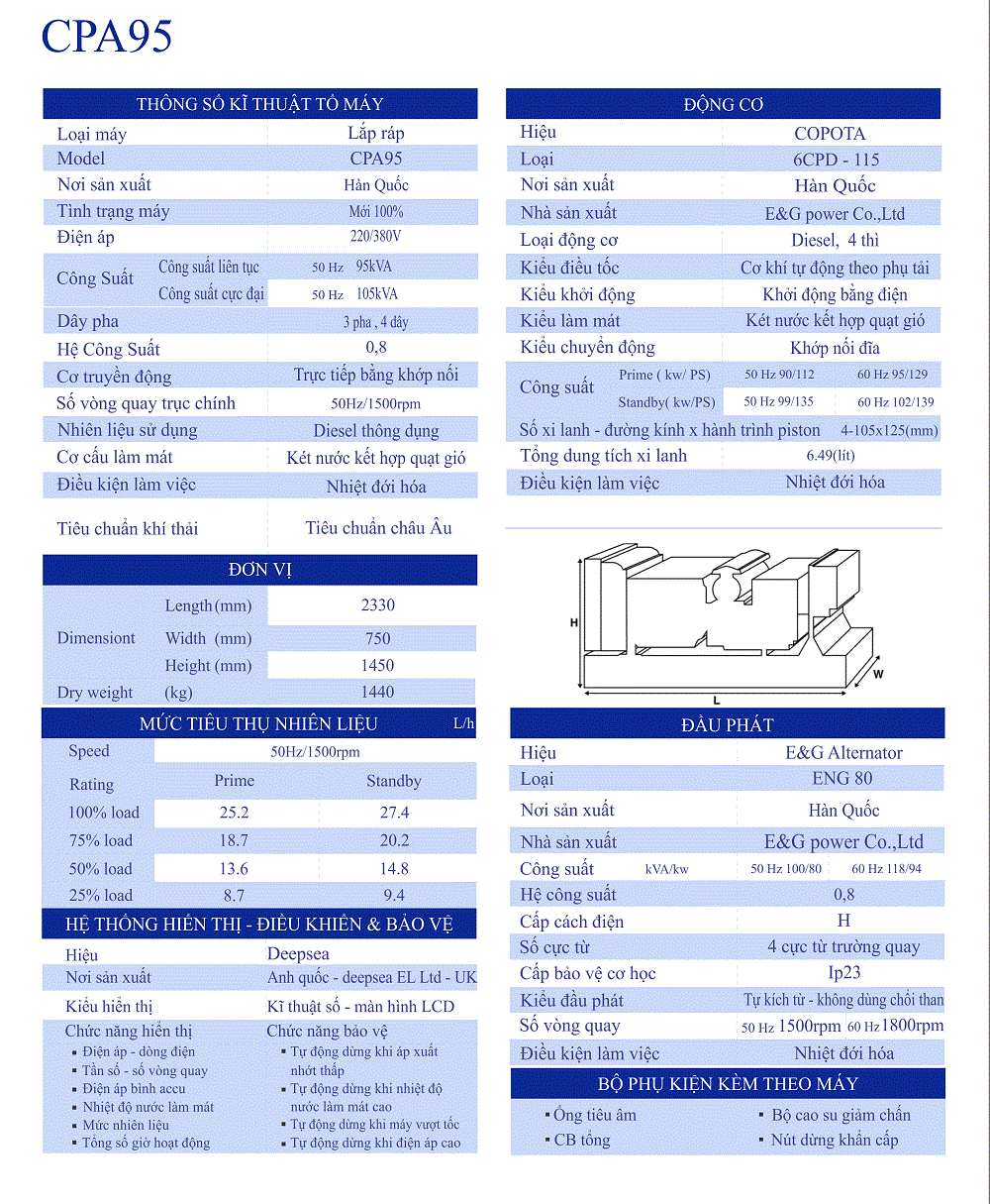 COPOTA CPA95 là một trong những loại máy phát điện phổ biến, được nhiều gia đình hay các hộ kinh doanh sử dụng. Đây là các dòng máy chạy bằng động cơ Diesel 4 thì. So với các động cơ khác thì dòng máy này có giá thành cũng như giá nhiên liệu rẻ hơn. Hiệu suất hoạt động cũng rất hiệu quả. Thuận Phong hiện là nơi cung cấp rất nhiều dòng máy phát điện khác nhau. Khách hàng có thể liên hệ 0909 724 830 để được hỗ trợ tư vấn, mua hàng và giao hàng tận nơi.
